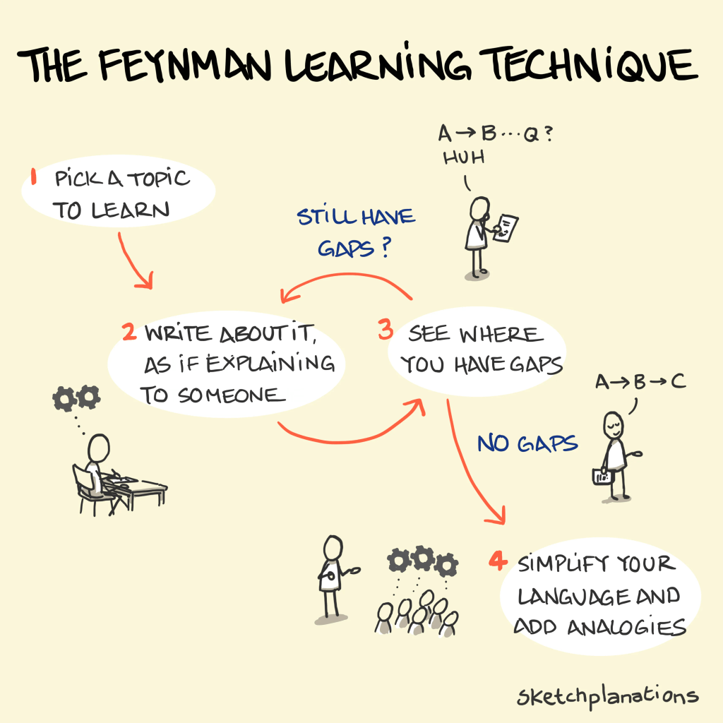 Il metodo consiste nel riformulare i concetti appresi in modo semplice e comprensibile, utilizzando un linguaggio semplice e facendo riferimento a esempi concreti. Questo metodo può essere utilizzato in vari campi: dall’apprendimento di nuovi concetti al consolidamento della comprensione di materie già note, dalla memorizzazione di informazioni importanti alla comunicazione di concetti difficili attraverso spiegazioni chiare e semplici.
