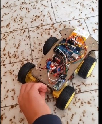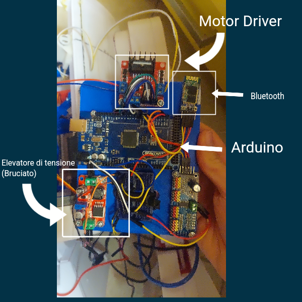 Si tratta di una macchinina telecomandata gestita da arduino, una scheda programmabile, e un circuito chiamato “motor driver”. Quest’ultimo serve perchè Arduino può inviare solo impulsi con un basso amperaggio e non è in grado di soddisfare la richiesta energetica dei motori collegati, quindi si utilizza una scheda che amplifica i segnali di arduino prendendo potenza direttamente dalla batteria.